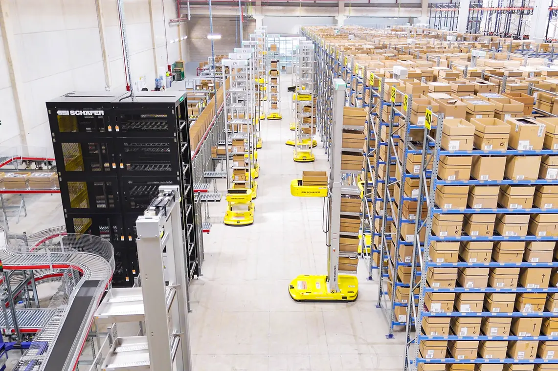 25 plně automatizovaných RackBotů ze série SSI Mobile Robots mělo zajistit požadovaný maximální obrat 30 000 jednotek denně při dvousměnném provozu a zároveň stabilní výkon v oblasti transportu a pickingu. RackBoty jsou autonomní mobilní roboty (AMR), které mohou současně přepravovat až 8 kartonů jako mobilní regálové zakladače s volností pohybu kdekoliv po skladu. RackBot Port, který také přepravuje až 8 kartonů současně, zajišťuje přenos do pickingové oblasti. Kromě instalace regálových jednotek a celkově čtyř pickingových stanic bylo plánování a implementace efektivního dopravního systému nedílnou součástí dodávky. Tímto způsobem bylo možné hotové kartony dopravit na nižší patra.