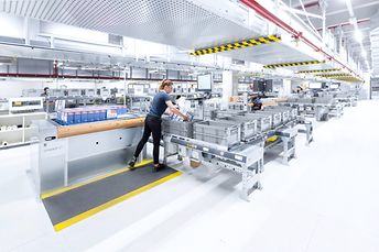Über Behälterfördertechnik sind die automatisierten Lagersysteme mit neun ergonomischen und produktschonenden Kommissionier-Arbeitsplätzen, den sogenannten Advanced Pick Stations, verbunden.