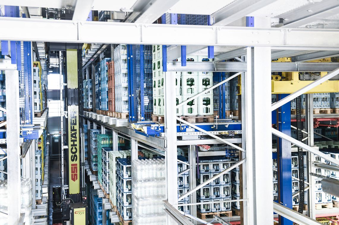 In order to maintain hygiene standards and throughput capacity, these material flows impact the HBW system technology. SSI SCHAEFER solved this problem with the smart approach of combining two different automation systems: Empties handling in the HBW is performed on the lower four levels only, which in total have a storage capacity of approx. 8,400 pallets. The Exyz storage and retrieval machines equipped with the SSI Orbiter LHD as load handling device, perform the storage and retrieval tasks. Schaefer’s Lift&Run system (SLR) is used in the same aisles to handle full pallets in the channel with the remaining 44,400 pallet storage locations. Four SLR, also equipped with the SSI Orbiter LHD as load handling devices, are stacked and operate in each aisle. During peak times, up to 495 inbound pallets and up to 750 outbound pallets are moved per hour. Added to this are additional transport quantities, which, however, are only processed directly via the electric monorail systems.