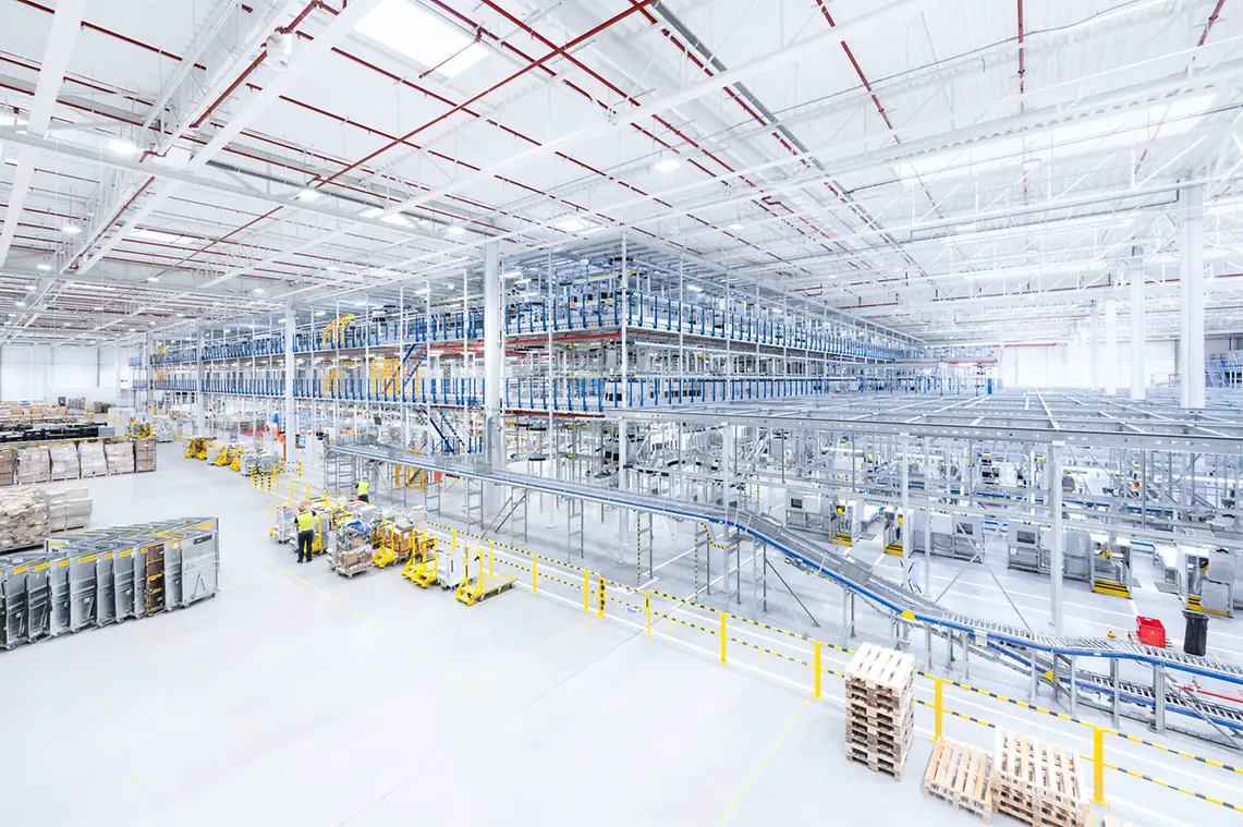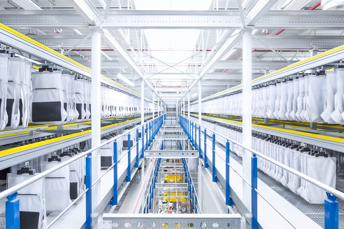 SSI SCHAEFER realized this, installing an extremely complex, highly dynamic intralogistics solution in the new e-commerce fashion warehouse in a space of more than 60,000 m². The total system runs 24/7, processing 70,000 orders per day. Peak performances of up to 600,000 items have already been achieved. The equipment includes container and carton conveying systems, a pick tower with four levels and an SSI Miniload small parts storage system with more than 600,000 storage locations when stored triple-deep. The heart of the system is the SSI Carrier, implemented in six modules, each spanning three levels and equipped with 120,000 pouches. This scalable overhead conveying system combines transport, buffering, sorting, and sequencing functions in a single system and allows fully automatic assembly of multi-part customer orders while protecting the products. Fast movers from returns are temporarily stored in the pouch sorter’s dynamic buffer, making them available directly for new orders.