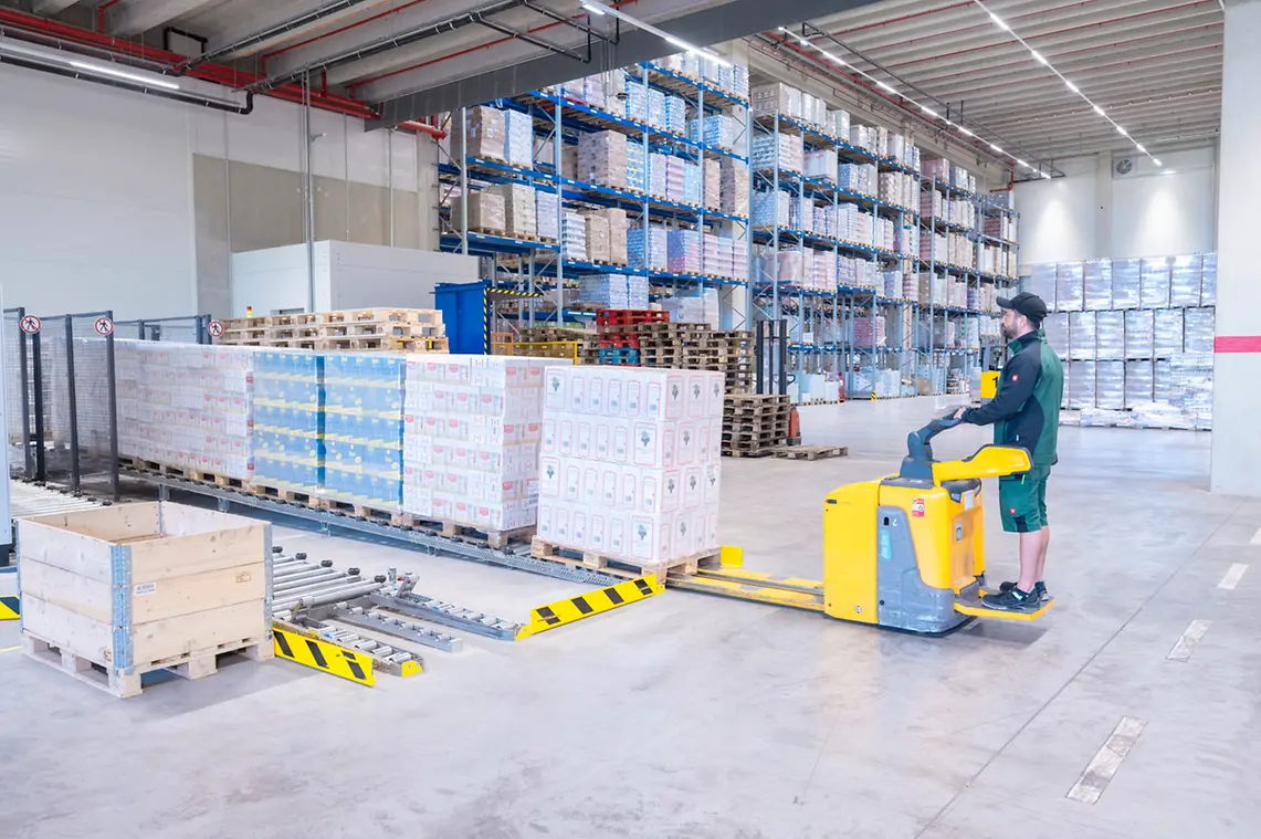 Apart from the 7,500 storage locations in the manual warehouse, the new, fully automated pallet high bay warehouse constitutes a real capacity upgrade: It provides space for a total of 11,000 pallets with double-deep storage and allows for a top performance even during peak times with four energy-efficient SSI Exyz storage-retrieval machines.  As requested, the automated warehouse was connected to a dispatch building and to an existing hall by means of a bidirectional conveying system, which ensures that goods can be flexibly moved into and out of the warehouse.
