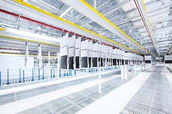 SSI SCHAEFER realized this, installing an extremely complex, highly dynamic intralogistics solution in the new e-commerce fashion warehouse in a space of more than 60,000 m². The total system runs 24/7, processing 70,000 orders per day. Peak performances of up to 600,000 items have already been achieved. The equipment includes container and carton conveying systems, a pick tower with four levels and an SSI Miniload small parts storage system with more than 600,000 storage locations when stored triple-deep. The heart of the system is the SSI Carrier, implemented in six modules, each spanning three levels and equipped with 120,000 pouches. This scalable overhead conveying system combines transport, buffering, sorting, and sequencing functions in a single system and allows fully automatic assembly of multi-part customer orders while protecting the products. Fast movers from returns are temporarily stored in the pouch sorter’s dynamic buffer, making them available directly for new orders.
