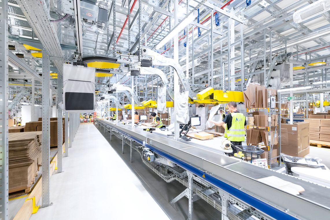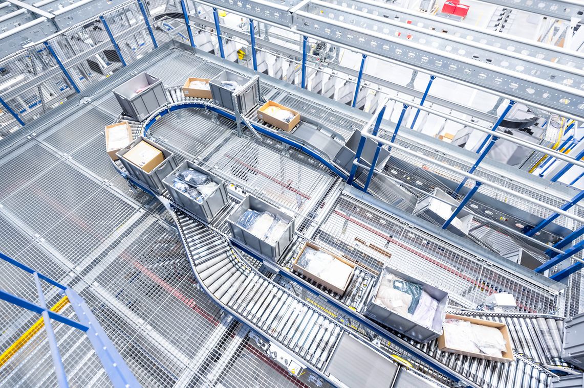 SSI SCHAEFER realized this, installing an extremely complex, highly dynamic intralogistics solution in the new e-commerce fashion warehouse in a space of more than 60,000 m². The total system runs 24/7, processing 70,000 orders per day. Peak performances of up to 600,000 items have already been achieved. The equipment includes container and carton conveying systems, a pick tower with four levels and an SSI Miniload small parts storage system with more than 600,000 storage locations when stored triple-deep. The heart of the system is the SSI Carrier, implemented in six modules, each spanning three levels and equipped with 120,000 pouches. This scalable overhead conveying system combines transport, buffering, sorting, and sequencing functions in a single system and allows fully automatic assembly of multi-part customer orders while protecting the products. Fast movers from returns are temporarily stored in the pouch sorter’s dynamic buffer, making them available directly for new orders.