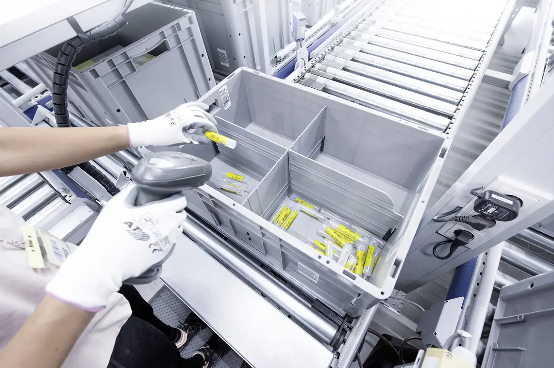 Orders comprising palletized goods and goods in the automated miniload system are consolidated completely automatically. The work areas needed for this have all been brought together in the system. They include four multi-order picker workstations and eight packing workstations for high picking performance. The warehouse currently stores 4,500 different items in total. Reliability, zero picking errors, short order throughput times, and high performance – all this despite limited space.