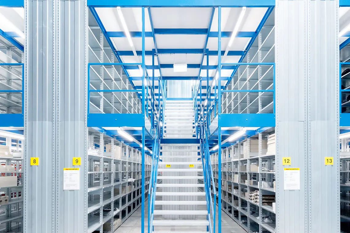 The three-story shelving system is fitted with a central staircase to reach the single floors.