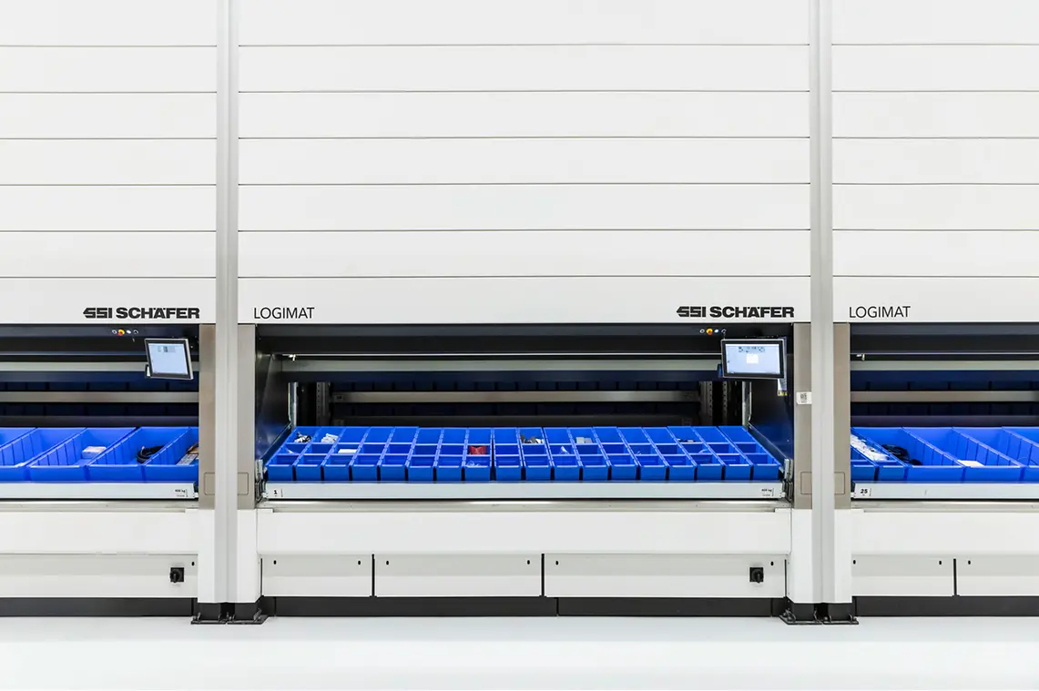 • SSI SCHAEFER Vertical Lift Modules will play a key role at the new site. Thanks to the compact vertical design of the SSI LOGIMAT® Vertical Lift System and the use of the hall height, an enormous storage density was achieved and the total logistics area was reduced by 35%.