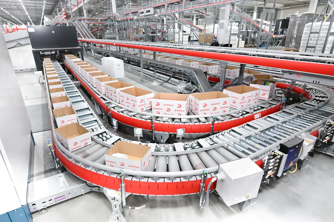 To further optimize cycle times and processes in the warehouse Apotea opted in 2023 for three more A-Frame systems, two more Pick by Light picking aisles and four BD RowaTM Vmax dispensing robots for prescription drugs. A five-kilometer-long bin and carton conveying system links everything together into a comprehensive intralogistics system.