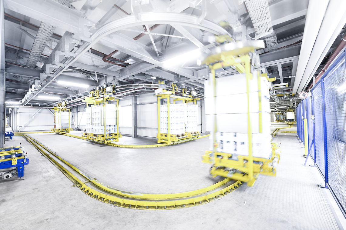 In order to maintain hygiene standards and throughput capacity, these material flows impact the HBW system technology. SSI SCHAEFER solved this problem with the smart approach of combining two different automation systems: Empties handling in the HBW is performed on the lower four levels only, which in total have a storage capacity of approx. 8,400 pallets. The Exyz storage and retrieval machines equipped with the SSI Orbiter LHD as load handling device, perform the storage and retrieval tasks. Schaefer’s Lift&Run system (SLR) is used in the same aisles to handle full pallets in the channel with the remaining 44,400 pallet storage locations. Four SLR, also equipped with the SSI Orbiter LHD as load handling devices, are stacked and operate in each aisle. During peak times, up to 495 inbound pallets and up to 750 outbound pallets are moved per hour. Added to this are additional transport quantities, which, however, are only processed directly via the electric monorail systems.