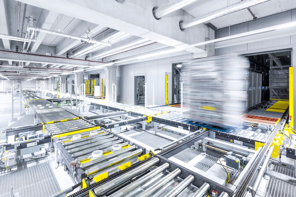 En el almacén de gran altura se utilizan cuatro máquinas de almacenamiento y recuperación SSI Exyz, que se caracterizan por su eficiencia energética y contribuyen así a la sostenibilidad. Por un lado, el diseño extremadamente compacto del SSI Exyz y el sistema de control optimizado garantizan un 5% más de espacio tras la instalación en comparación con los almacenes de estanterías elevadas con sistemas de almacenamiento convencionales. Esto significa que el SSI Exyz elimina muchos metros cúbicos que de otro modo habrían tenido que construirse, calentarse o climatizarse. Por otra parte, un contrapeso integrado en el mástil ahorra por completo la energía necesaria para el mecanismo de elevación desde el principio. Las máquinas de almacenamiento-recuperación convencionales sólo pueden recuperar esta energía de forma incompleta y con escasa eficiencia eléctrica. Los estándares de SSI SCHAEFER incluyen dinámicas de accionamiento y curvas de accionamiento optimizadas para la demanda, accionamientos energéticamente eficientes y recuperación de energía interna y externa.