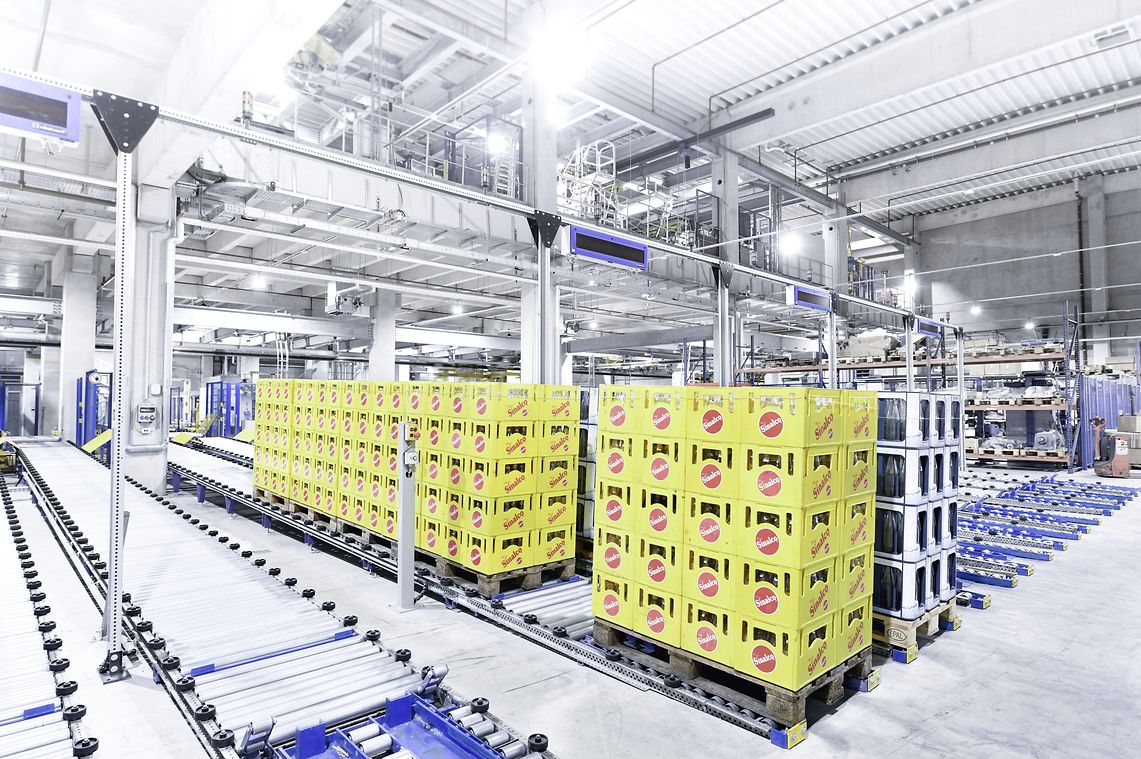 El objetivo del proyecto era aumentar las capacidades de RheinfelsQuellen hasta una cobertura de existencias de diez días, simplificar los procesos mediante la automatización y un control coordinado de la producción y las capacidades, orientándolos a pedidos cada vez más pequeños, y aumentar en consecuencia el potencial de ahorro en logística. Otro reto era suministrar los envases vacíos en la mezcla correcta, en el momento oportuno y en la cantidad adecuada a la línea correcta, y garantizar que las devoluciones de los minoristas al centro logístico fueran rápidas y estuvieran compuestas principalmente por una mezcla de productos y tamaños de botella. Sin embargo, los sistemas de producción llenan por producto. La gestión de los envases instalados para la expedición secuenciada tiene en cuenta la posibilidad de que pasen camiones por las instalaciones de la fábrica.