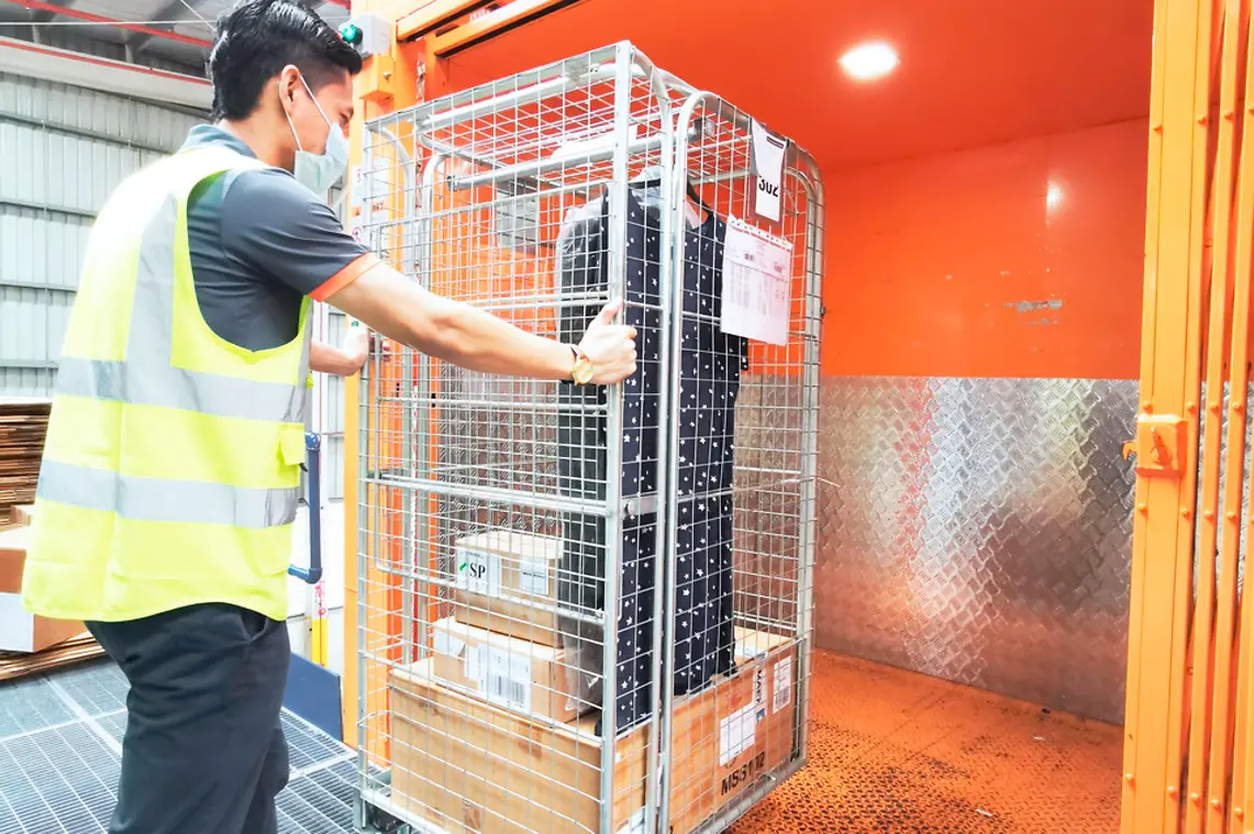 Kerry Logistics를 위해 개발된 세심한 보관 솔루션은 두 의류를 평평한 포장 상자에 보관하고 GOH (Garment on Hangers)에 보관하도록 구성되어 있습니다. 의류가 일부 또는 전체 공급망을 옷걸이에 걸려 이동하든, 공급망의 일부 단계에서 의류는 레일이나 끈에 매달리는 대신 옷걸이에 부착된 상태로 상자에 넣을 수 있습니다. 또한 메자닌은 더 높은 지대에서 작업 중인 창고 직원을 보호하기 위한 안전 기능으로서 그물망 시스템을 갖추고 있어 창고 내의 안전한 환경을 보장합니다.
