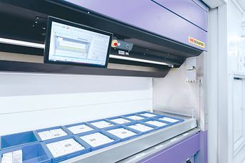 SSI LOGIMAT®는 GTP(Goods-to-person) 원리를 이용하여 주문 처리 워크플로우를 단순화하고 ERP 시스템의 주문을 처리하여 병원, 클리닉 및 일반 상점에서 주문한 제품을 피킹 및 보충합니다.