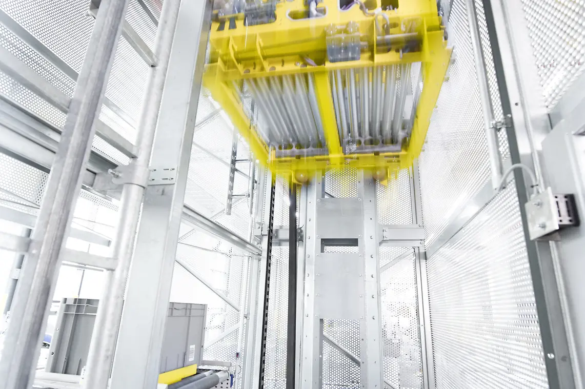 Cea mai frapantă caracteristică a soluției specialistului în intralogistică este configurația specială a zonei de preluare și ambalare. Această zonă se află la nivelul solului și acționează ca un conector între celelalte două unități de depozitare. Deasupra și dedesubt este poziționată o zonă de depozitare automată, oferind în total peste 36.000 de locații de depozitare. Sistemul de navetă utilizează 21 de navete SSI Navette și nouă lifturi SSI Navette. Navetele SSI Navette se deplasează de-a lungul unui nivel de conducere pe șine și șine de susținere care utilizează structura metalică a sistemului miniload automatizat. Două dispozitive de manipulare a încărcăturii cu adâncime dublă, dispuse una deasupra celeilalte, permit navetei să deplaseze simultan un total de patru unități de încărcare pe două niveluri de depozitare într-un singur ciclu de încărcare. Acest lucru minimizează timpii de deplasare și dublează eficiența procesului. În plus, lifturile SSI Navette asigură livrarea rapidă a containerelor din zonele de depozitare la nivelul de preluare.