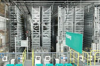 The facility hosts three aisles with three SSI Miniload storage-retrieval machines for automatic storage and retrieval with a maximum of 27,720 storage locations. There are four picking stations with Pick to Light workstations and four packing consolidation areas. And, there are four levels of pallet storage for production.