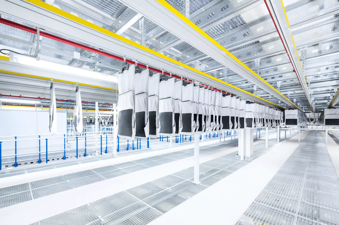 SSI SCHAEFER realized this, installing an extremely complex, highly dynamic intralogistics solution in the new e-commerce fashion warehouse in a space of more than 60,000 m². The total system runs 24/7, processing 70,000 orders per day. Peak performances of up to 600,000 items have already been achieved. The equipment includes container and carton conveying systems, a pick tower with four levels and an SSI Miniload small parts storage system with more than 600,000 storage locations when stored triple-deep. The heart of the system is the SSI Carrier, implemented in six modules, each spanning three levels and equipped with 120,000 pouches. This scalable overhead conveying system combines transport, buffering, sorting, and sequencing functions in a single system and allows fully automatic assembly of multi-part customer orders while protecting the products. Fast movers from returns are temporarily stored in the pouch sorter’s dynamic buffer, making them available directly for new orders.